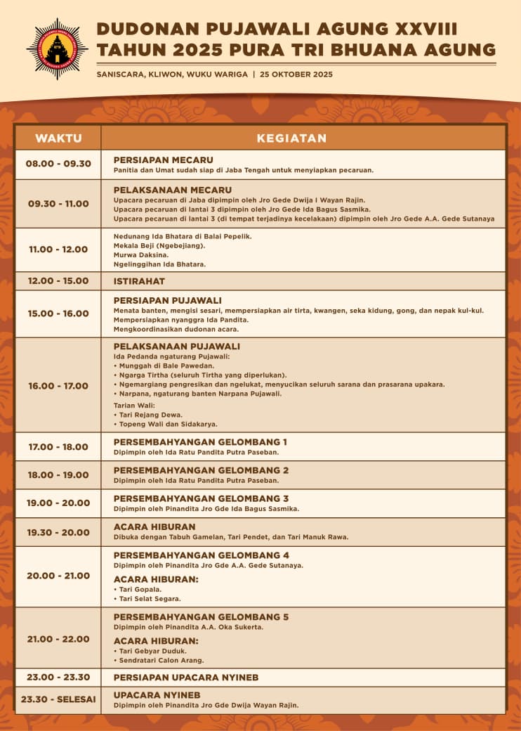 Berikut dudonan atau rundown Pujawali Agung XXVIII Pura Tri Bhuana Agung Depok: